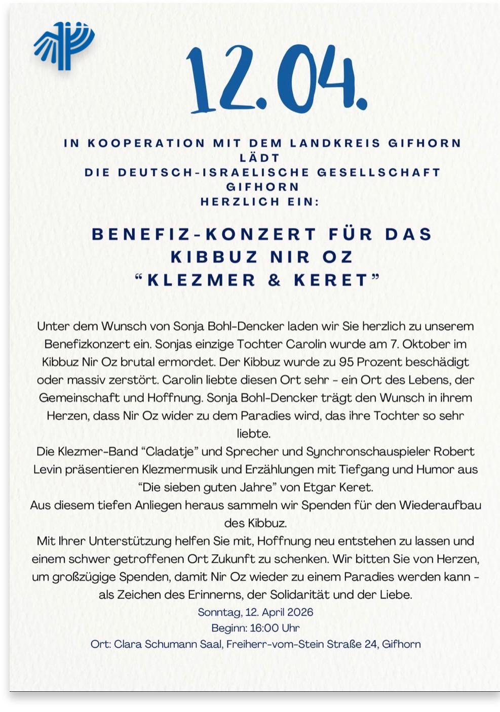 Am Sonntag, 12.04., um 16 Uhr laden wir Sie in Kooperation mit dem Landkreis Gifhorn zu einem Benefizkonzert für das Kibbuz Nir Oz ein. Dieses findet im Clara-Schumann-Saal der Volkshochschule Gifhorn statt. Weitere Infos entnehmen Sie auch hier bitte dem angehängten Flyer.